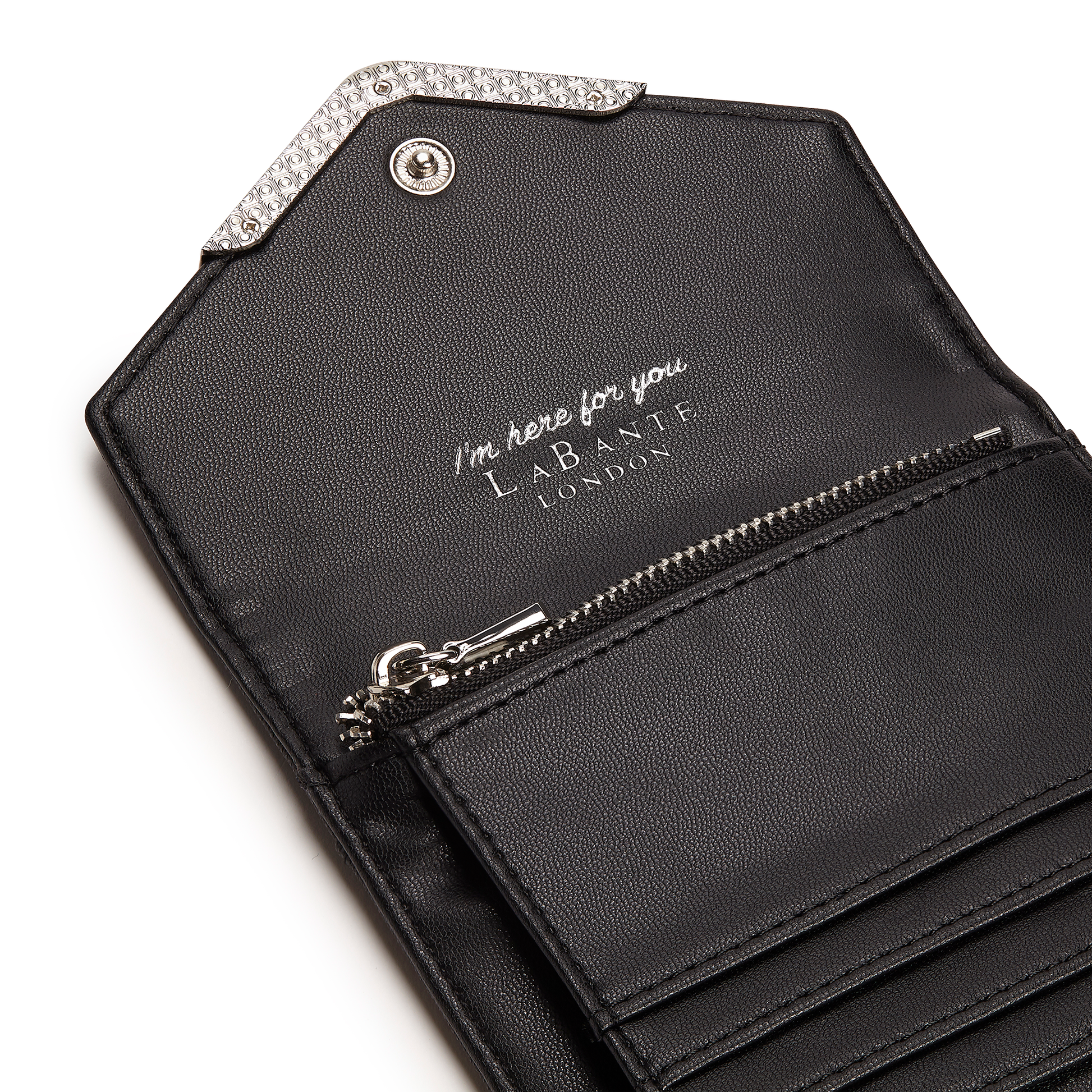 This classic Diana Vegan Bifold purse by Labante - London. Designed on faux saffiano textured Faux Leather, this Faux Leather Purse comprises of eight card slots, a note compartment and a zip coin compartment with a Fold over top with press stud closure featuring silver metal details and an embossed logo.